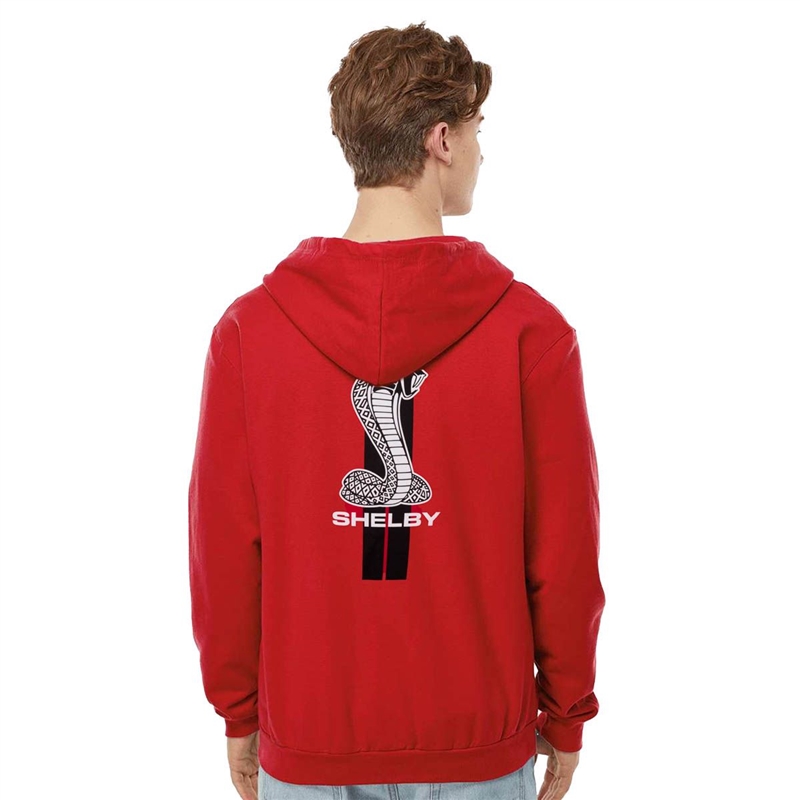 クラシックなシェルビー スネーク ロゴと背面のレーシング ストライプ グラフィックがスタイルを演出し、3 エンド フリース生地とフリース裏地付きの 3 パネル フードが雨風を寄せ付けません。